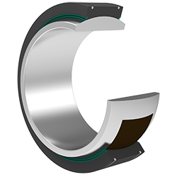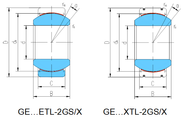 产品特点:外圈有一道轴向缝,材料为不锈钢,淬火,球面粘贴PTFE编织物;内圈材料为不锈钢,淬火。型号后置代号为XT,表示外圈沿轴向剖分成两半,用锁圈固定。